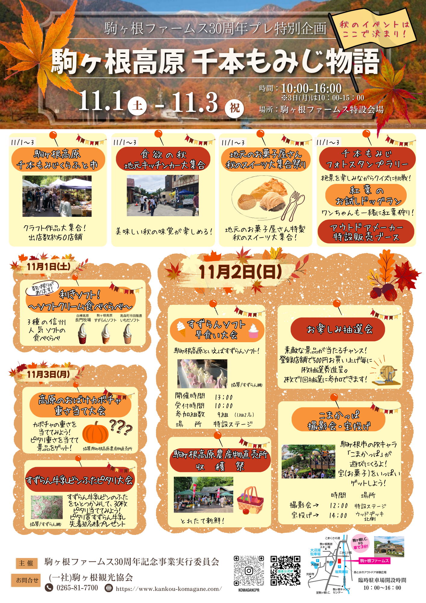 来年度、駒ヶ根ファームスは施設開設30周年という大きな節目を迎えるにあたり、長年のご愛顧に感謝するとともに 、紅葉シーズンを盛り上げるプレイベントを開催します!