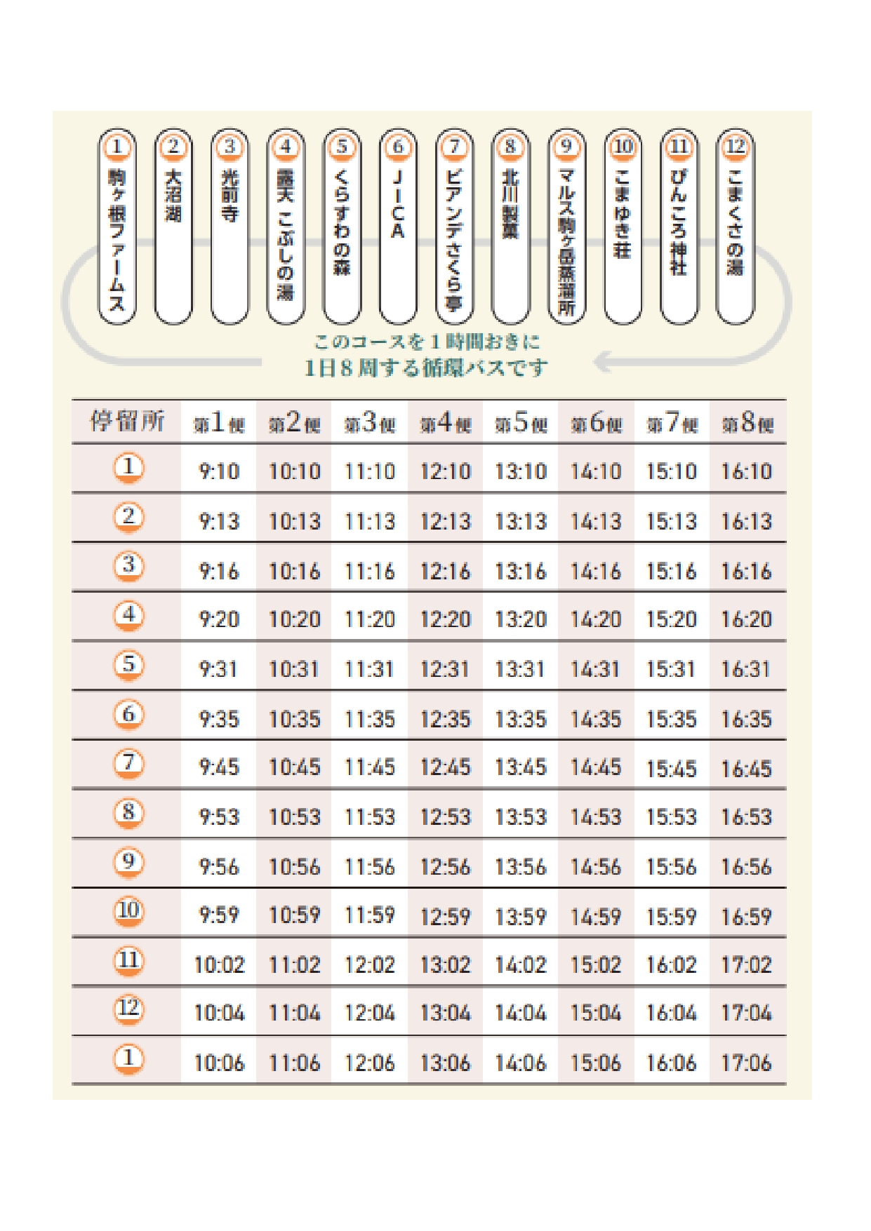 駒ヶ根ファームス(主要停留所)を起点に、大沼湖光前寺露天こぶしの湯(家族旅行村)、くらすわの森(養命酒駒ヶ根工場)、JICA(駒ヶ根青年海外協力隊訓練所)、ビアンデさくら亭北川製菓マルス駒ヶ岳蒸溜所こまゆき荘ぴんころ神社(二人静)、そしてこまくさの湯といった駒ヶ根高原を代表するスポットを巡ります。